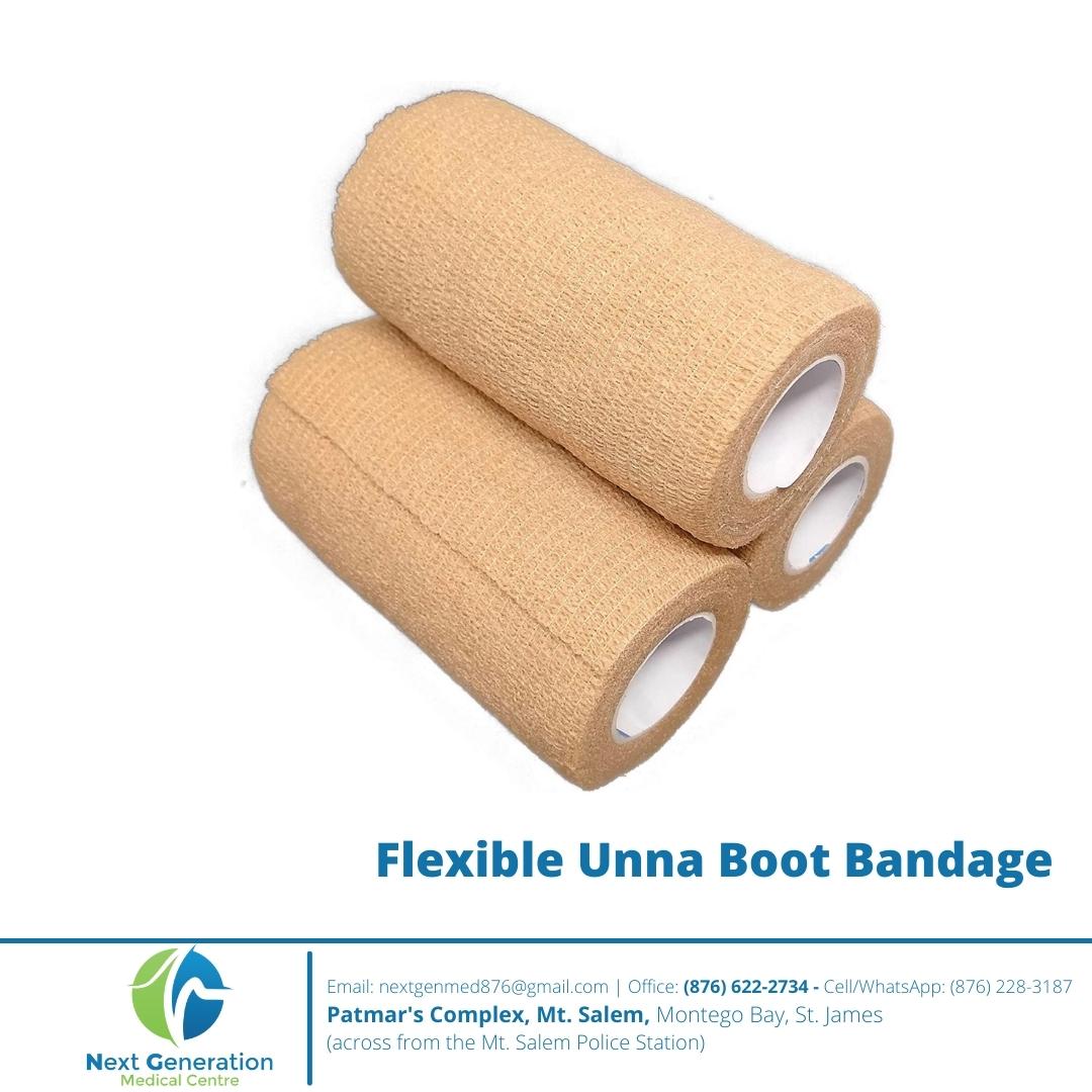 The Flexible Unna Boot Bandage is used in the treatment of venous stasis leg ulcers, thrombophlebitis, lymphatic edema, sprains, strains, and dislocations. This gauze bandage has been evenly soaked with a non-hardening paste of zinc oxide to provide venous ulcer compression therapy, dressing compression, and zinc oxide helps improve blood flow. The bandage does not gray into wound sites, is self-adhesive, and enhances the patient’s comfort.